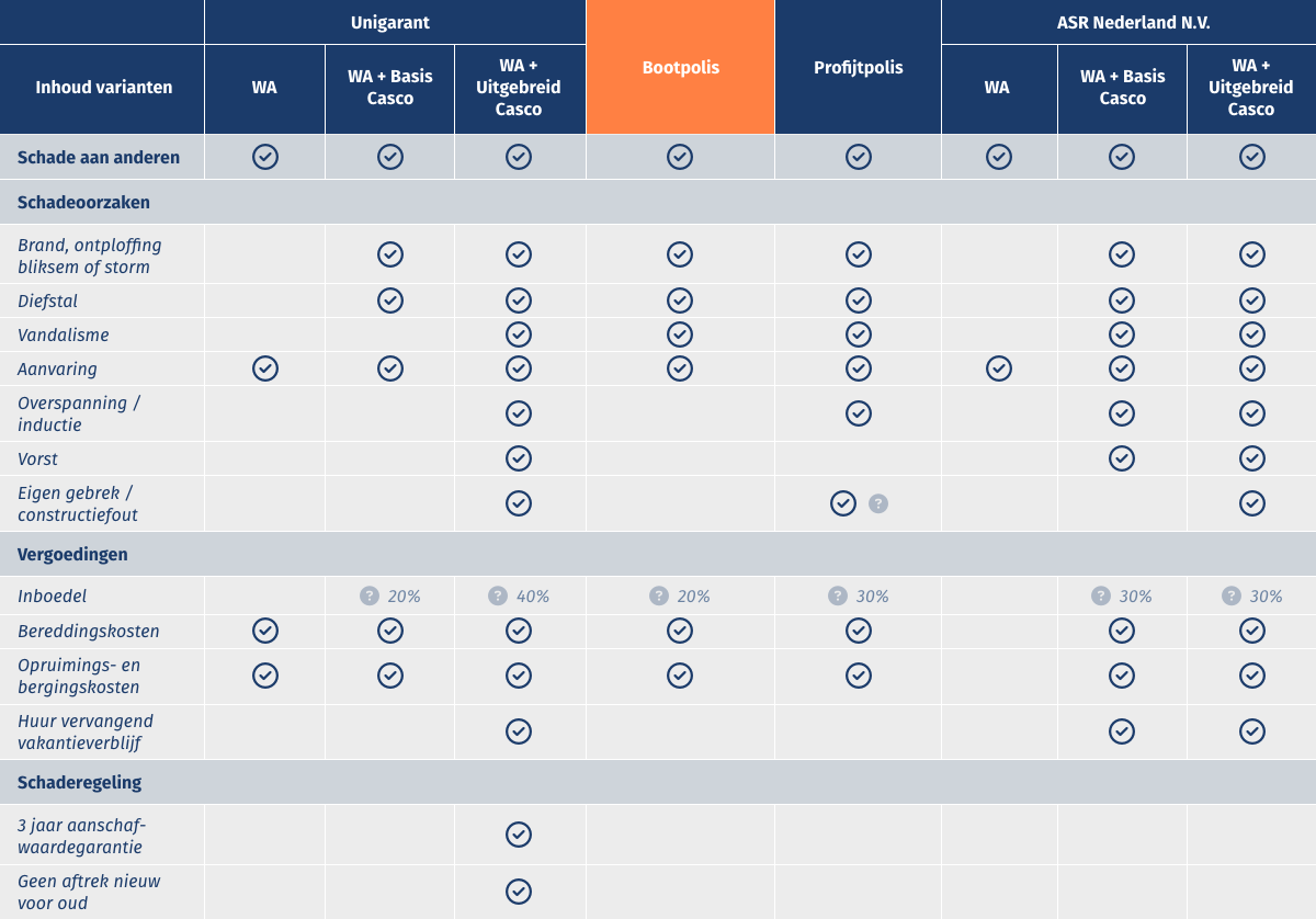 Hiervoor wordt samengewerkt met verschillende verzekeringsmaatschappijen, zoals Unigarant, ASR Nederland N.V. en Nationale-Nederlanden. Daarnaast zijn er ook voordelige eigen polissen beschikbaar, zoals de Bootpolis en de Profijtpolis.